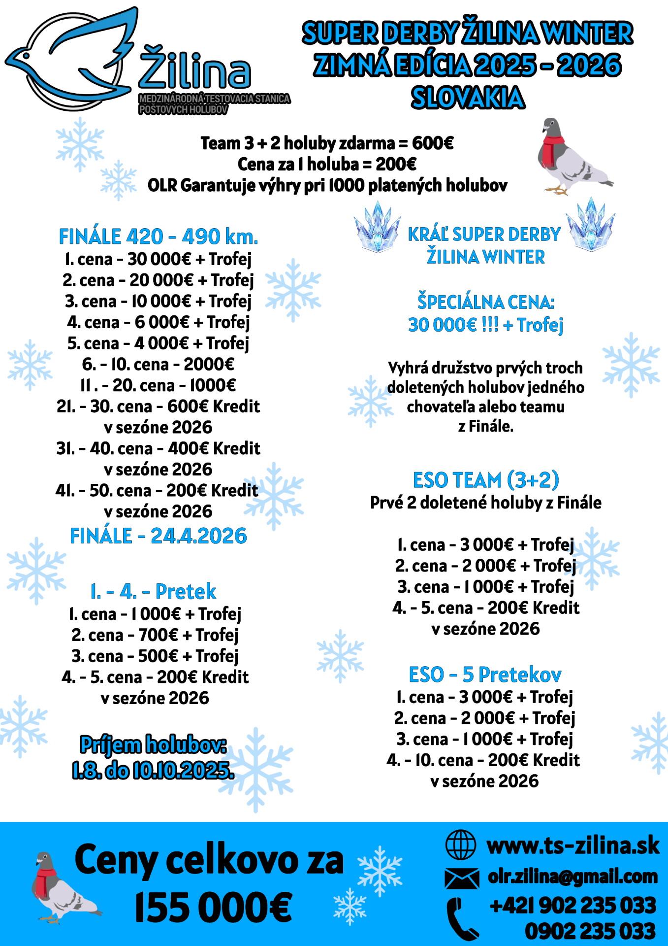 Propozície a ocenenia v zimnej edícii: Team 3 + 2 holuby zdarma, čiže 5 kusový team za 600 eur.
